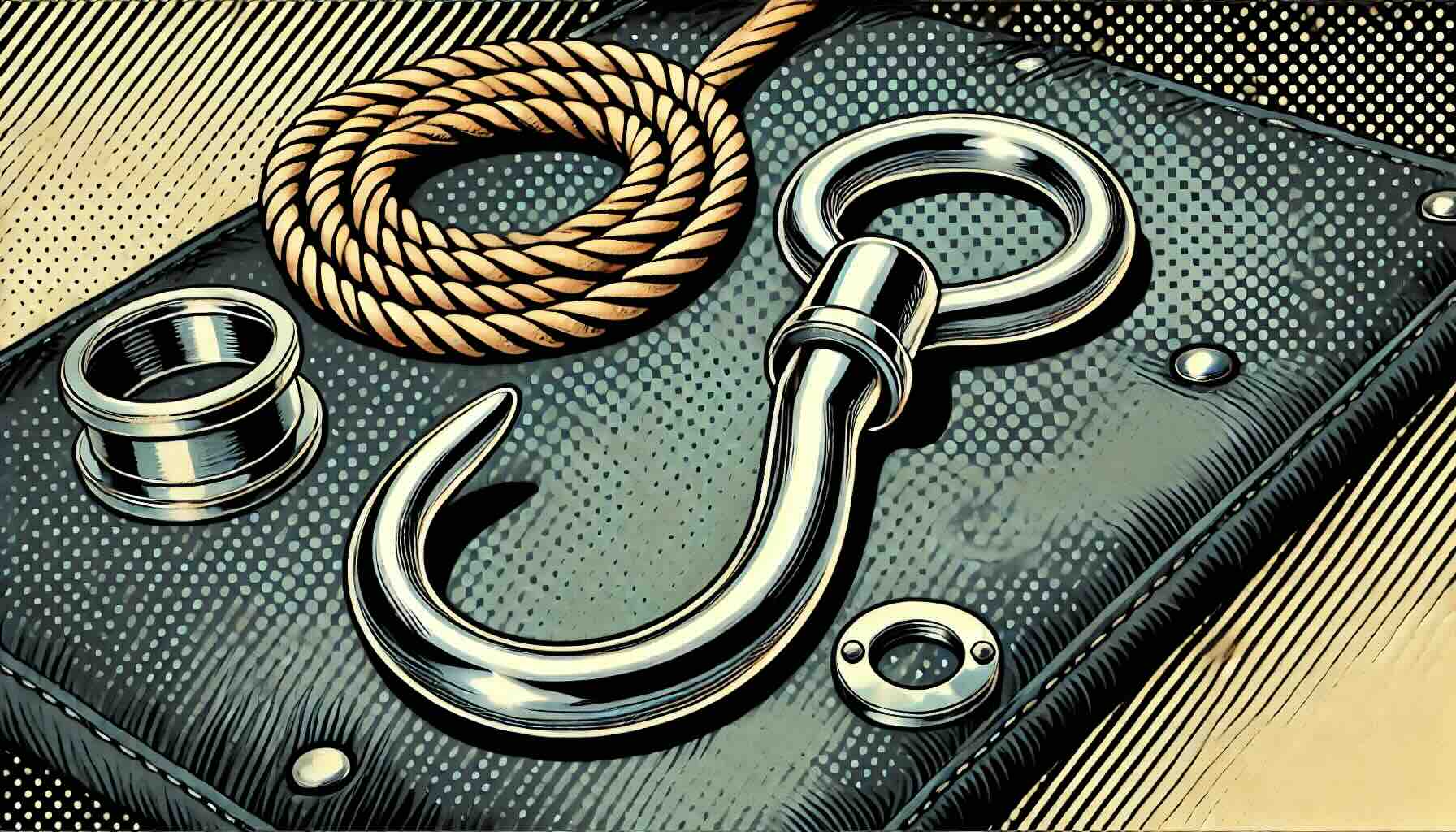 - Rope, bondage cuffs, collar, or harness—something to tie the hook to
